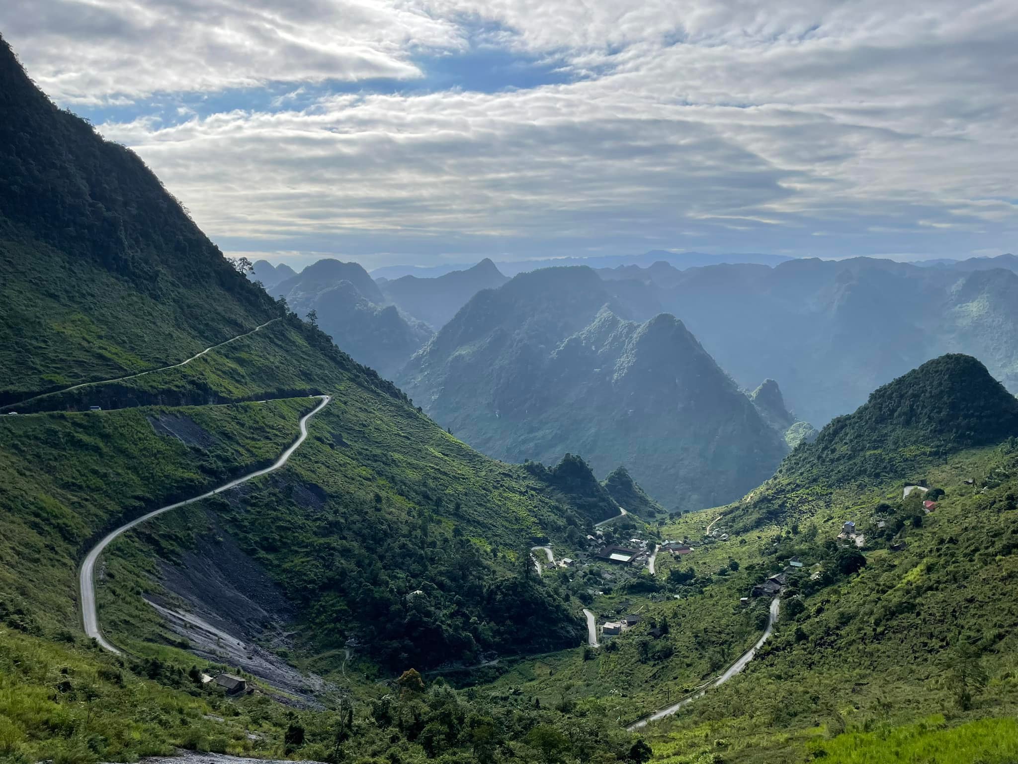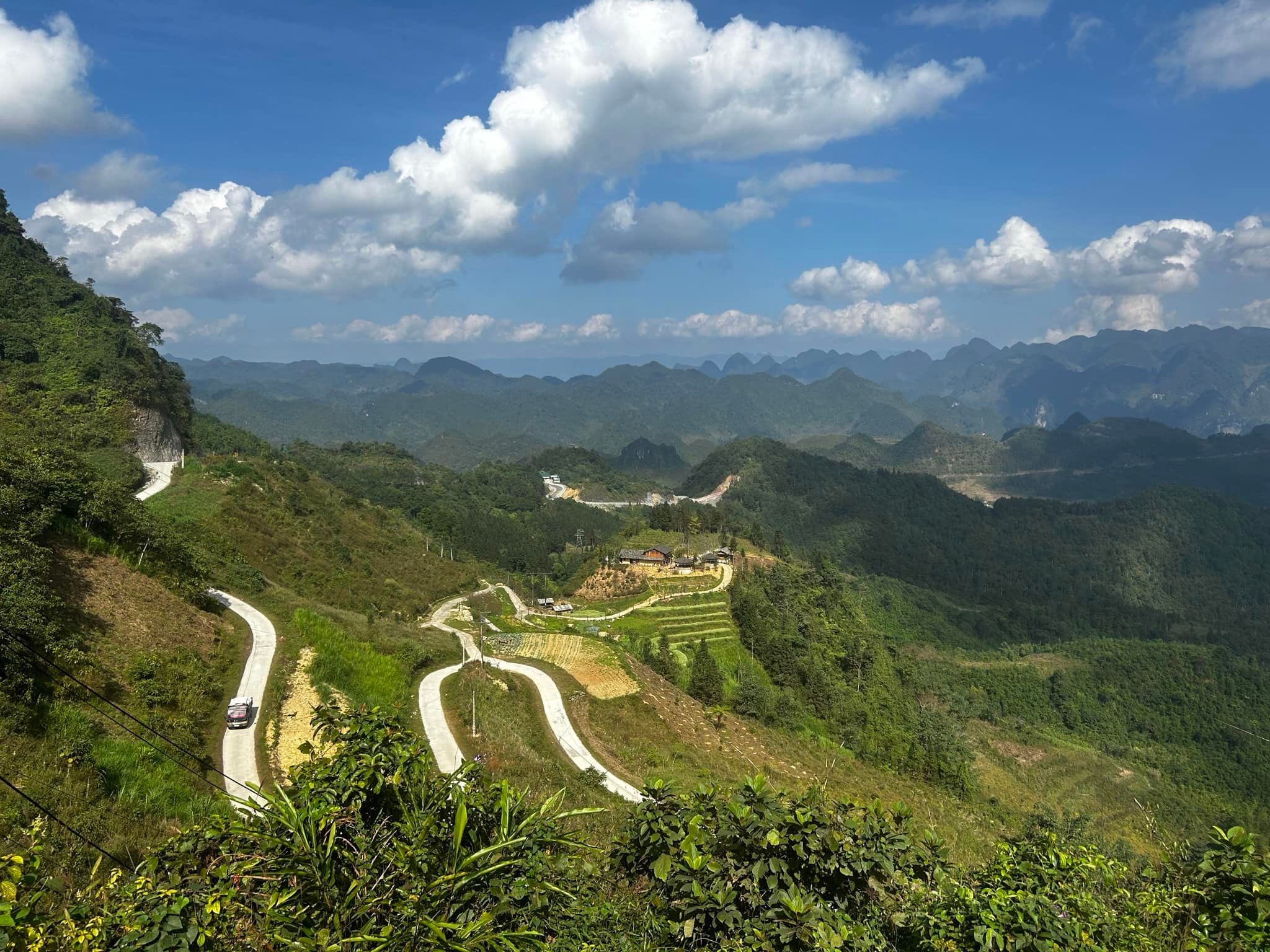 The road from Thai An back to Ha Giang city winds through dramatic canyons and steep cliffs, with deep abysses opening up beside the path. At certain points, you can even catch sight of the massive walls of a hydroelectric dam, standing in stark contrast to the wild mountain landscape.